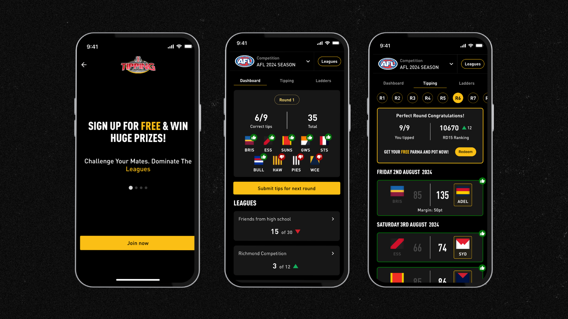 A fan engagement tipping platform built as a live add-on experience to drive participation and repeat engagement across multiple sports with competition creation and rewards based on tipping performance.